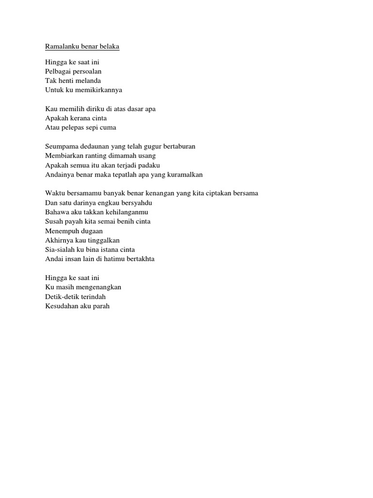 Bahawa aku takkan kehilanganmu. Lirik Lagu Ramalanku Benar Belaka Umbrella Hingga ke saat ini Pelbagai persoalan Tak henti melanda Untuk ku memikirkannya Kau memilih diriku di atas dasar apa Apakah kerana cinta Atau pelepas sepi cuma Seumpama dedaunan yang telah gugur bertaburan Membiarkan ranting dimamah usang. Lirik lagu melayu umbrella ramalanku benar belaka by umrella.